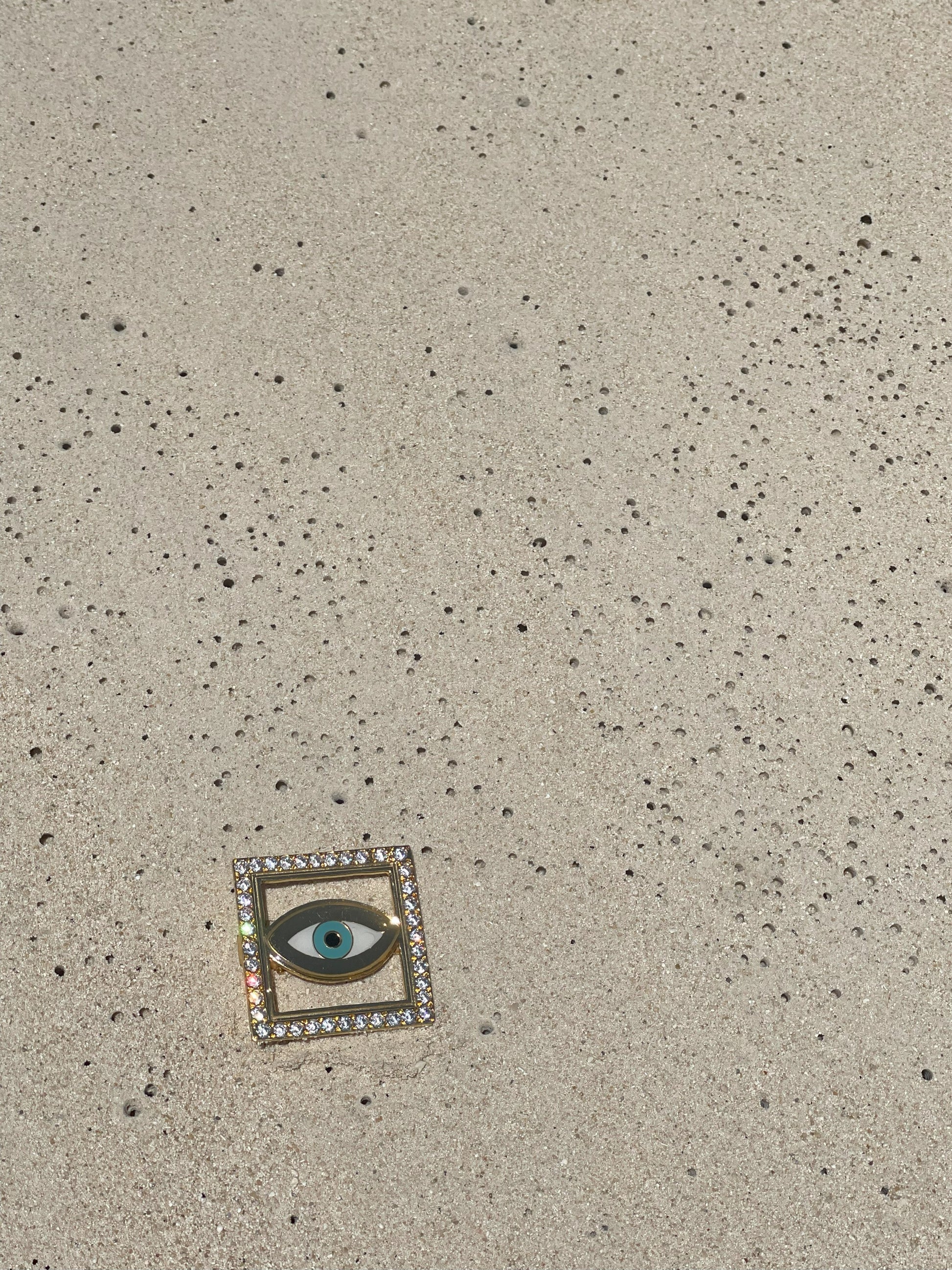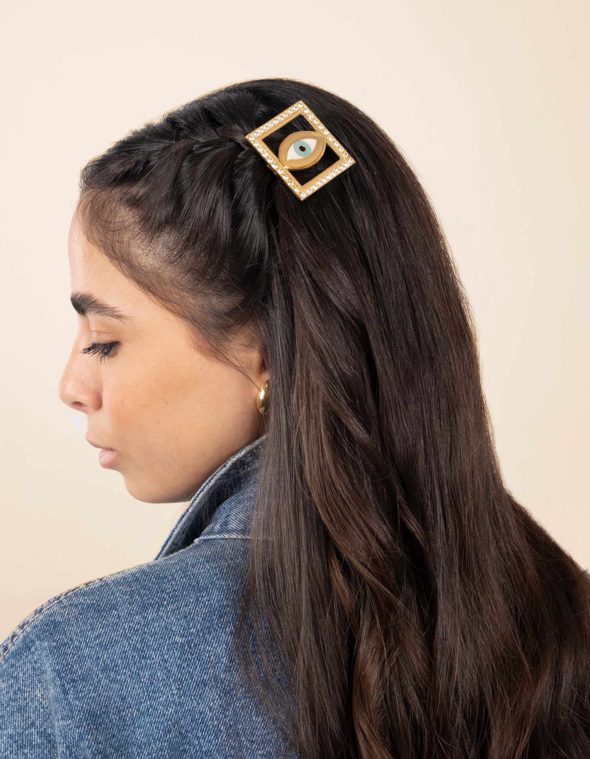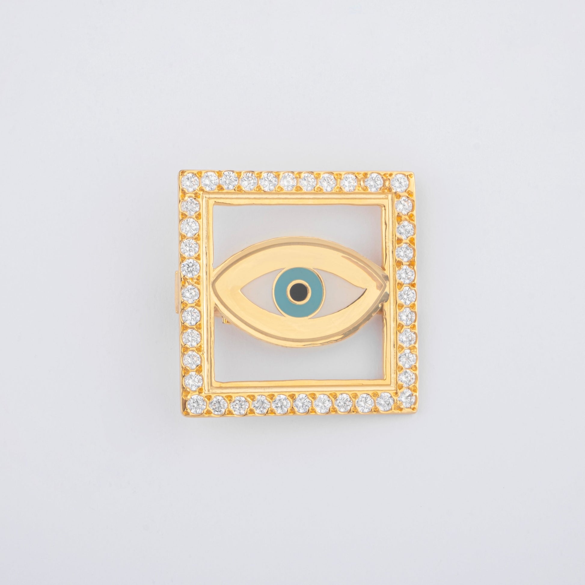 Gaze and Grace is a striking eye motif, handcrafted from brass and plated with 18k gold. The eye is detailed with delicate enamel painting, while shimmering jewels surround it — blending symbolism, elegance, and artistry in one timeless piece.